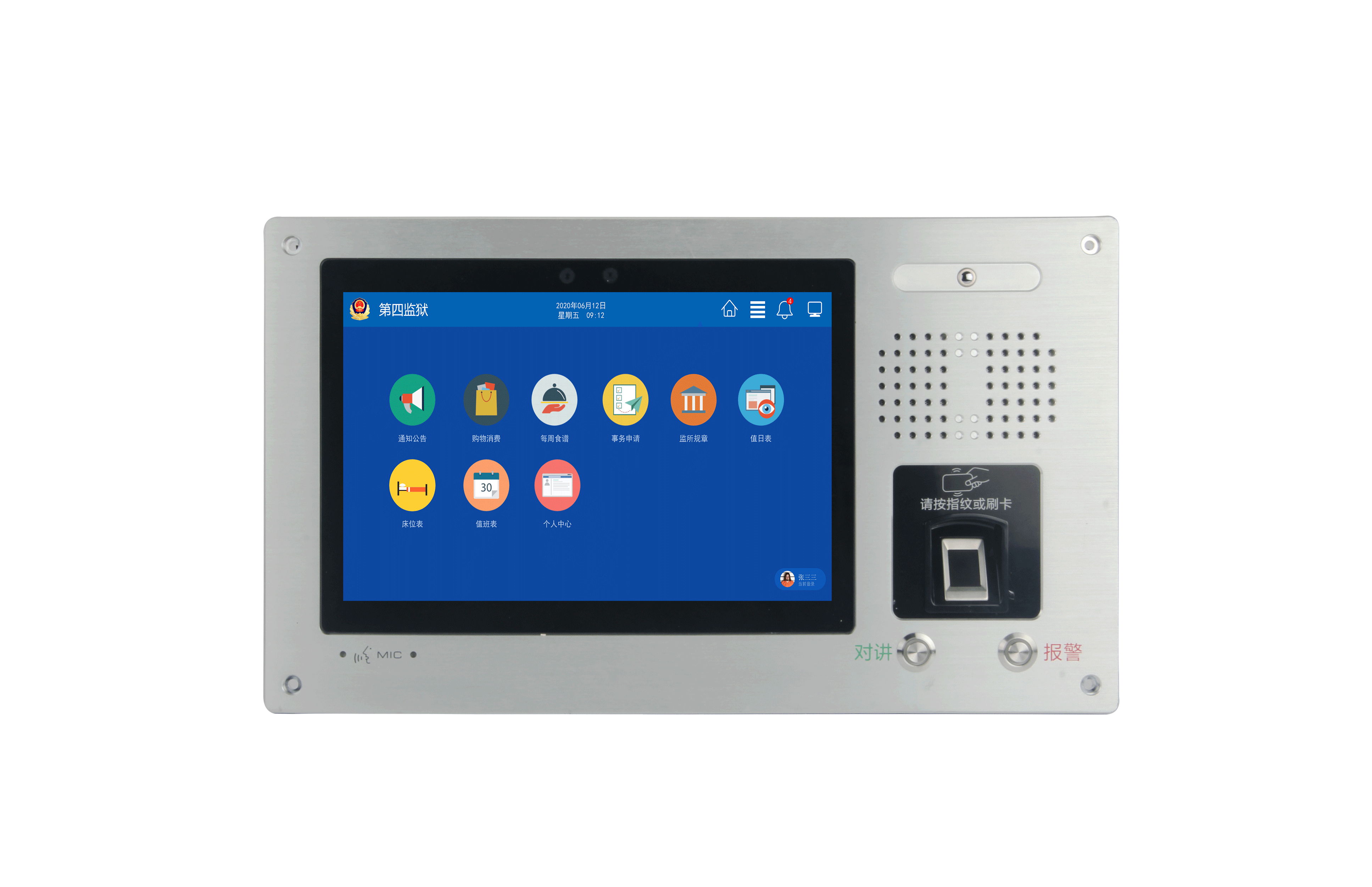 监室点名: 在押人员使用IC卡或生物识别方式在智能监仓交互式终端进行点名报道,并将点名结果经监狱内部网络上传至管理后台。点名过程全程使用手环或指纹进行操作,确保了点名的准确性。